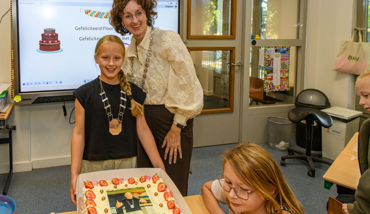 Het is vandaag een bijzondere dag voor Floor van Ruremonde! Zij werd vanochtend in haar eigen klas op Kindcentrum De Plataan geรฏnstalleerd als jeugdburgemeester. Burgemeester Judith Keijzers-Verschelling en haar voorganger Elise Baselmans overhandigden haar de ambtsketen, die ze het hele schooljaar met trots mag dragen. Het feestelijke moment werd natuurlijk gevierd met een heerlijke taart.